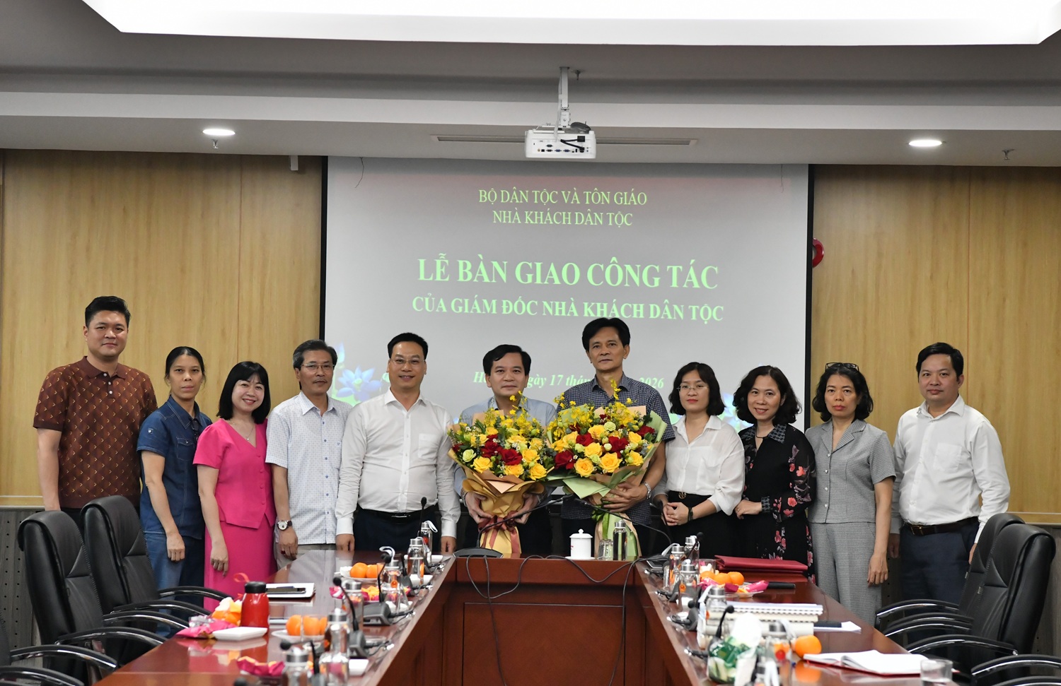 1 giờ trước | Lượt xem: 46 In bài viết |Ngày 17/4/2026, tại Trụ sở Bộ đã diễn ra Lễ bàn giao công tác của Giám đốc Nhà khách Dân tộc, Bộ Dân tộc và Tôn giáo. Tham dự buổi lễ có ông Bùi Thiện Lạc, Giám đốc Nhà khách Dân tộc; ông Trần Tuấn Anh, Phó Giám đốc Thường trực Nhà khách Dân tộc; ông Vũ Thành Lê, Chuyên viên Chính Vụ Kế hoạch - Tài chính và viên chức, người lao động Nhà khách Dân tộc.